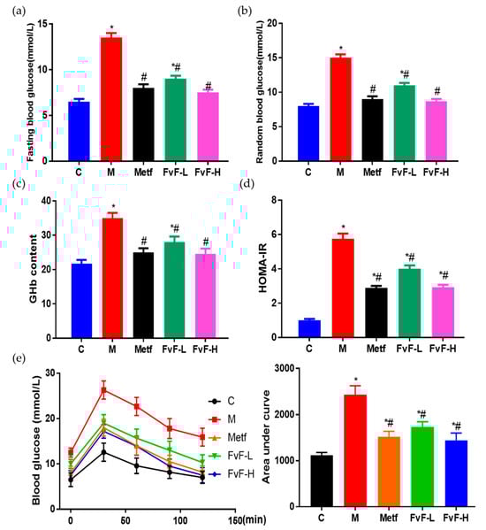 Effects of fucoidan from Fucus vesiculosus (FvF) on the blood glucose related physiological indexes in high-fat diet (HFD) and streptozotocin (STZ)-induced MetS mice. (a) Fasting blood glucose; (b) Random blood glucose; (c) Glycated hemoglobin (GHb) content; (d) Homeostatic model assessment for insulin resistance (HOMA-IR), calculated by fasting blood glucose (mmol L−1) * fasting insulin (mU/L)/22.5; (e) Oral glucose tolerance test (OGTT) was conducted at the ninth week. C, mice were fed a normal diet; M, mice were fed a HFD; Metf, mice were fed a HFD with 225 mg/kg/day metformin; FvF-L, mice were fed a HFD with 20 mg/kg/day FvF; FvF-H, mice were fed a HFD with 100 mg/kg/day FvF. Data are expressed as the mean ± SEM. Differences were assessed by ANOVAs and statistical results are denoted as follows: * p < 0.05 versus the control group; # p < 0.05 versus the model group.