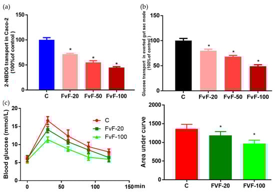 We investigated whether FvF could decrease blood glucose levels via inhibiting glucose transport in small intestine. Thus, we used the in vitro, semi-in vivo, and in vivo models to confirm it. The inhibitory activities of FvF on the transport of glucose analogue, the fluorescent tracer 2-(N-(7-nitrobenz-2-oxa-1,3-diazol-4-yl)amino)-2-deoxyglucose (2-NBDG), in the Caco-2 monolayer model are shown in Figure 7a. In Figure 7b, the everted gut sac model also indicated that FvF had significant inhibitory activity on glucose transport. Finally, the OGTT conducted on normal mice confirmed that FvF could decreased postprandial glucose levels in a certain degree of dose-dependent manner (Figure 7c). Therefore, the inhibition of FvF on glucose transport in the small intestine might be part of the underlying mechanism affecting the ameliorated blood glucose levels and IR, which needs more attention in future research.