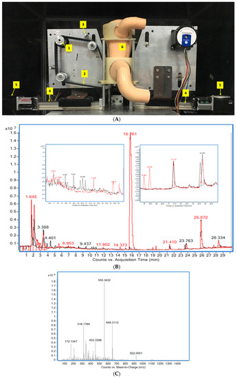 (A) In vitro dynamic stomach model: the numbers 1–6 respectively represent stepper motor, timing belt, compression roller, timing belt guide, screw motor, and silicone stomach. (B) Representative chromatograms highlighting the compounds characterized before and after the digestion of Jackfruit flake: The chromatogram was obtained using the positive ion mode. (C) Mass spectrum of compound (6) in positive mode. (D) Mass spectrum of compound (11) in positive mode.