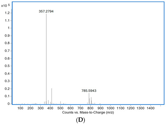 To test whether the polyphenols in the jackfruit flake change before and after digestion, the phenolic compositions of JFE and JFG were identified by HPLC-MS. The compounds detected by time-of-flight mass spectrometer (TOF) can be used to obtain the molecular formula based on the exact molecular weight as shown in Table 2 and Figure 1B. The peaks of the main 21 compounds are listed based on the peak areas of the individual phytochemicals. The possible identities of these 21 compounds were determined by the data in the scientific literature and the available real standards: (3) prenyl-7-hydroxy [9]; (4) marmesin isomer [9]; (6) caffeic acid derivative [10,11]; (7) apigenin-6-C-glucosyl-8 carabinoside [12]; (8) citric acid derivative [11], (10) ferulic acid-O-hexoside [11], (11) feruloylglucoside [10,11,13], (12) caffeoylquinic acid [10,11], (13) skullcapflavon [12], (14) neochlorogenic [10], (16) gartanin [14], (18) dihydroxybenzoic acid malonyl hexoside [15], and (20) p-coumaric acid-O-hexoside [10,11,13]. The compounds were identified by data from the experiments and the scientific literature. Compound (6) (tR66 min) displayed a [M + H]+ ion at m/z 555; according to [10,11], the compound may be considered to be a caffeic acid derivative (Figure 1C), and compound (11) (tR = 18.965 min), [M + H]+ at m/z 357, classified as hydroxycinnamic acid, may be feruloylglucoside (Figure 1D). The summarized results showed that a proportion of compounds in jackfruit flake were degraded/converted into other unknown and/or undetected metabolites after the in vitro digestion.