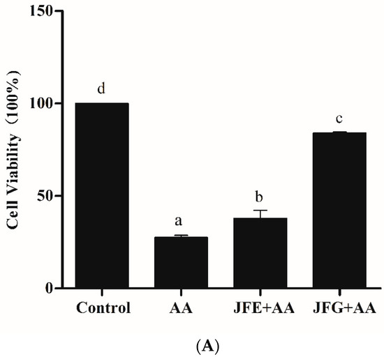 Mitochondria are important plants for cellular aerobic respiration and oxidative phosphorylation, and their health is closely related to the amount of intracellular ROS. In Figure 4A,C, the mean fluorescence intensity of the mitochondrial membrane potential was significantly decreased to 29.65% ± 0.61% (p < 0.05), and the mitochondrial membrane permeability was 143.97% ± 1.41% (p < 0.05) in AA groups, compared with the control groups. To the contrary, the mitochondrial membrane potential mean fluorescence intensities of the JFE and JFG groups were significantly increased by 59.01% ± 0.78% and 83.66% ± 0.72% (p < 0.05) of the control groups, respectively, and the mitochondrial membrane permeability mean fluorescence intensity of the JFE and JFG groups were 117.05% ± 1.93% and 102.13% ± 1.64% (p < 0.05), respectively.
