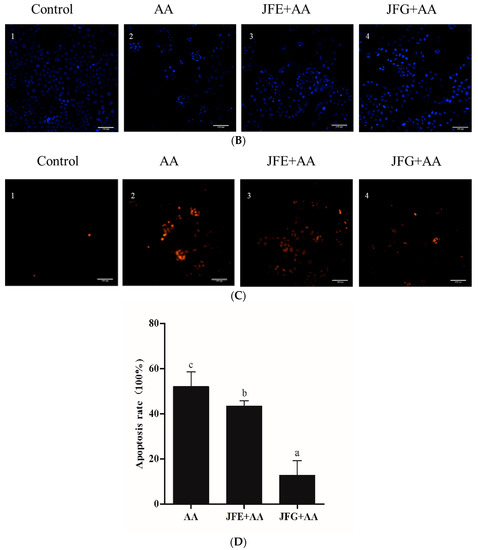 Based on these phenomena, we used Hoechst 33342 and Propidium Iodide (PI) fluorescent dye and further explored the apoptosis of AA-induced cytotoxicity in Caco-2 cells in JFE and JFG. In Figure 2B,C, the mean fluorescence intensity of AA groups was significantly increased compared with control groups. Additionally, the mean fluorescence intensity of JFE and JFG was weaker than that of the AA groups, especially JFG. In Figure 2D, compared with control groups, the apoptotic rates of AA groups were 51.99% ± 6.40% (p < 0.05). In contrast, the apoptosis rate of JFG decreased to 12.72% ± 6.48% (p < 0.05). The result suggested JFG was able to effectively ameliorate AA induced toxicity.