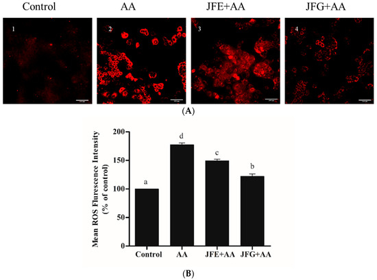 Deep red reagent which was located in the cytoplasm. (A) Caco-2 cells were treated with 2 g/L AA for 2 h, with or without 2 mg/mL JFE or JFG for 24 h, and photographed using HCA. Scale bars = 100 (B). The mean ROS fluorescence intensity of AA groups, JFE groups, and JFG groups, and the control groups (set to 100%). The data was expressed as mean percent (mean ± standard deviations), and different letters in the bars within each group represent statistically significant differences (p < 0.05).