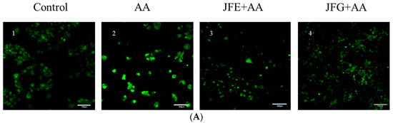 As shown in Figure 3B, the fluorescence intensity of AA groups increased to 177.5% ± 2.43% (p < 0.05) compared with control groups (the mean fluorescence intensity was 100%). Moreover, JFE and JFG groups significantly reduced the mean fluorescence intensity to 149.3% ± 0.86% and 122.2% ± 1.70% (p < 0.05), respectively, indicating that JFE and JFG had protective effects on AA-induced oxidative stress in Caco-2 cells. JFG provided more effective protection.