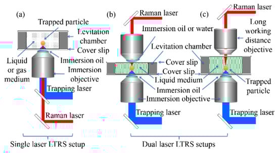 By considering the number, type, and disposition of the microscope objectives used in LTRS couplings, two general types of beam configurations can be utilized. The most common configuration uses a single inverted microscope immersion objective (Figure 1a), through which one (for simultaneous trapping and Raman analysis) or two (one for trapping and one for Raman analysis) lasers can be focused. This kind of setup has been widely used for microbiology studies of single living cells [17,18,19,20,21,22,23] and bacteria [24,25,26,27,28,29] in aqueous solution as well as for physicochemical studies of polymer microspheres [30,31,32], carbon nanotubes [33], and small proteins [34] in liquid media. It has also been used to study individual microdroplets (aerosols) in the gas phase [4,6,8]. The second main configuration of LTRS uses two microscope objectives, one for capturing and one for Raman scattering. In this case, two variants are utilized: (i) a configuration with two immersion objectives (Figure 1b), in either the vertical [35] or horizontal [36] orientation; or (ii) a vertical arrangement with an inverted immersion objective and an upward long-working-distance (LWD) objective for Raman measurements [37] (Figure 1c). Although the use of two-objective LTRS instruments has been devoted to biological particles captured in liquid media such as single cells and protein aggregates [35,36,37], the availability in this setup of an extra objective, in addition to that used for capturing, will open the possibility of using confocal Raman microscopy to perform spectral mappings on airborne aerosols. This enables the possibility of carrying out in situ studies of the chemical distribution of its components. Some horizontal variations have been reported using two LWD objectives, through which two counter propagating hollow beams (CPHB)—produced by splitting a single laser trap beam—are focalized on particles levitated in air [38]. However, this type of configuration does not allow the change of Raman excitation lines and makes the implementation of confocal Raman microscopy impractical. Other configurations using fiber beam traps instead of microscope objectives have also been reported for the study of living cells in solution [39,40].