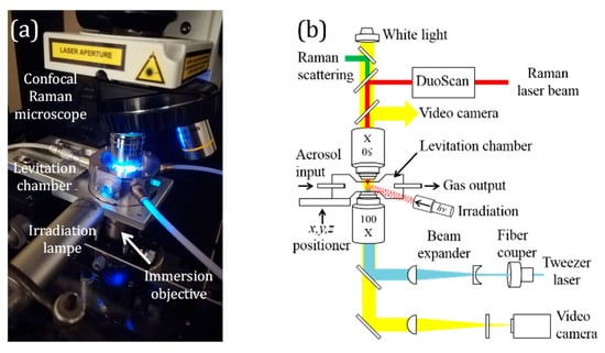 Experimental setup. (a) Photograph and (b) schematic diagram of the dual-objective LTRS system used in this study for the physico- and photochemical study of levitated aerosols in air.