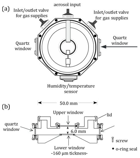 A schematic diagram of the designed levitation chamber is presented in Figure 3. The levitation chamber provides a sealed environment for the study of single particles suspended in air. Different atmospheric conditions can be reproduced and a wide variety of physical, chemical, and photochemical processes can be performed. This consisted of a custom made octagonal stainless-steel cell with a removable cover for easy access and cleaning of the interior. The sidewalls of the chamber were equipped with injection and exhaust ports, openings for different windows (e.g., quartz or glass) for photochemical measurements, and a temperature/humidity sensor. An aerosol injection port was precisely directed at the center of the device in order to trap particles. In the central part of the lower surface, the chamber has a circular hole that is covered from the inside with a coverslip (160 µm thickness), and treated with a surfactant solution (sodium dodecyl sulfate, SDS, 1 mM) prior to each levitation experiment to avoid droplet formation on the coverslip. The upper lid was equipped with an opening for a quartz or glass window for visualization and Raman image collection through the LWD microscope objective. The internal distance between the lower surface and upper lid was around 6 mm. All of the openings in the levitation chamber were air tight due to the use of O-ring seals. The coverslip was pressed against the bottom O-ring by two semicircular metallic shields as part of the removable cover. These shields limit the capture volume and concentrate the particles in the center of the cell near the trapping point.