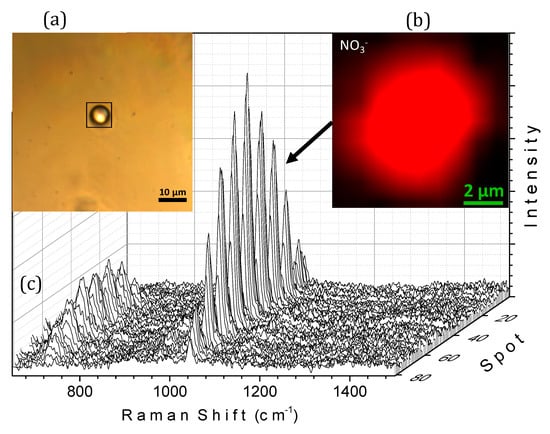 Figure 5 also shows the Raman spectra of the droplet initially containing an aqueous solution of NaNO3 and after 30, 90, 150, and 270 min of exposure to UV light. Each Raman spectrum was collected with the DuoScan™ system using an averaging mode across a predefined circular area corresponding to the droplet’s diameter (8 µm for the droplet in Figure 5). After 30 min of irradiation, new bands were observed at 1337, 814, and 1262 cm−1, similar to the ν1, ν2, and ν3 vibrational modes of the NO2− ion reported at 1330, 820, and 1243 cm−1 in bulk aqueous solution [43], respectively, and observed at 1330, 815, and 1278 cm−1 for the photochemically formed ion in a microdroplet using acoustic levitation [12]. A new feature at 914 cm−1 was also observed with irradiation, which was identified as the bending mode of peroxynitrite ion, ONOO− [12,44].