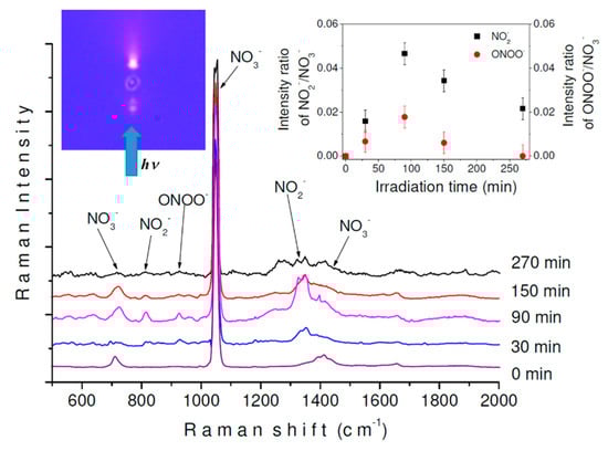 As shown in the plot of the intensity ratio of NO2−/NO3− and ONOO−/NO3− as a function of irradiation time (inset in Figure 5), both photoproducts showed similar behavior with irradiation time. These were increased until a maximum concentration of NO2− and ONOO− ions in the droplet was observed after 90 min of irradiation. When photolysis reached 270 min, ONOO− disappeared while the NO2− band intensities decreased. Detection of the NO2− ion as the final photoproduct in this experiment is in line with the overall photolysis reaction NO3− → NO2− + O2 (formed from O• radicals) reported for nitrate in an aqueous medium using λ ≥ 195 nm [45,46]. In the present study, ONOO− was consumed after 270 min of irradiation, and the NO2− was decreased, but not completely eliminated. This is similar to other studies where ONOO− was identified as an intermediate in the formation of nitrite by photoisomerization of NO3− at λ < 280 nm [45,47]. However, some background fluorescence was observed to increase in the Raman spectra beyond 90 min, and observed intensities could have overlapped.