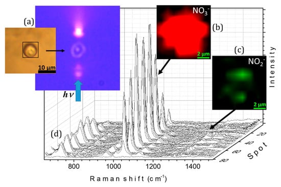 After optical trapping and Raman analysis of the single NaNO3 particle, the droplet was exposed to a collimated UV beam (254 ± 25 nm). Changes were monitored by recording the Raman spectrum as a function of the irradiation time. As the diameter of the UV spot from the lamp was larger than the size of the drop, the particle was completely covered by the radiation beam, thus ensuring full irradiation of the droplet. The photograph within Figure 5 provides a visualization of the particle during irradiation exposure, where the blue arrow indicates the direction of the lamp’s beam. The droplet is illuminated when the UV beam goes through it and some reflection and transmission of light can be observed in the picture. To the best of our knowledge, this is the first time that a photochemical study with Raman mapping has been performed on an optically levitated airborne microdroplet. The development of this instrument was primarily due to experimental difficulties associated with the design and construction of coupling LTRS cells.