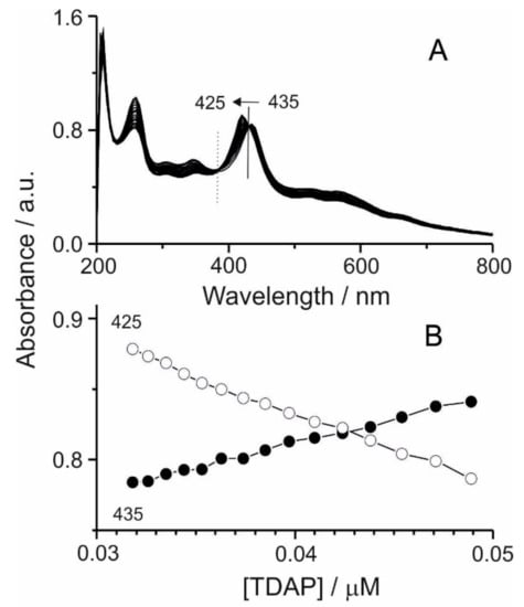 By analysis of the isosbestic points [21], the stoichiometric ratio was determined to be 2:1 (TDAP:TCPP), providing additional evidence for the binding of the porphyrins. The titrimetric curve (Figure 2B) illustrates the strength and stoichiometry of the TDAP/TCPP interaction.