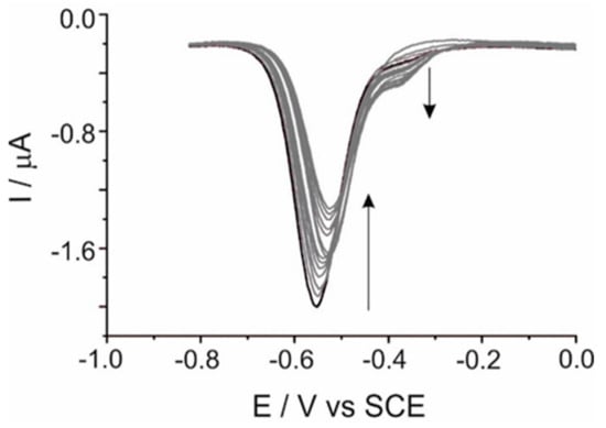 Apparently, the self-assembled product is more easily reduced than the TDAP alone, and this product is not possible to oxidize back. These two facts reflect the stability of the reduced product. Since the reduction at about −0.360 V seems to be irreversible, we hypothesize that the acid-base interactions are broken at this potential. The TDAP redox signal appears at less negative potentials as a consequence of its interaction with the reduced TCPP after the breaking of the assembled compound, making it less stable. The proposed mechanism of the redox behavior for the formation of the molecular assembly is shown in Scheme 3. Additional evidence for this mechanism comes from the monitoring of the TDAP-TCPP titration, explored by differential pulse voltammetry. The voltammetric profiles and response of the system is illustrated in Figure 4. Each individual addition of TCPP is monitored after equilibration. At a scan rate of 20 mV s−1, the initial measured redox signal appeared at about −0.55 V with a corresponding cathodic current of −1.8 µA. As an increased amount of TCPP is added, the magnitude current decreases, and the peak potential is shifted to less negative values (about 30 mV). The decreasing of the current is accompanied by the rise of a new redox signal at about −0.370 V, which correlates well with the peak observed by cyclic voltammetry. The decreased current and the emerging redox signal can be associated with the formation of the assembled nanostructure. It is expected that the TDAP current decreases as the quantity of TCPP increases, since some of the TDAP molecules are being shared with the TCPP to form the supramolecular assembly via electrostatic interaction, and the new assembly has a different redox potential, which indicates less stability (compared to TDAP) to the applied potential.