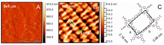 Bright porphyrin protrusions define molecular rows, which are aligned in pairs in the short direction of the unit cell (Figure 5B). The fact that such a large structure can be accommodated parallel to the substrate and maintained at standard conditions is due to the fact that the TDAP-TCPP molecule is linked to the gold substrate by weak interactions. These interactions, although weak, are systematically repeated over the entire substrate, keeping the TDAP-TCPP molecule linked without using an external factor as an electrical potential.