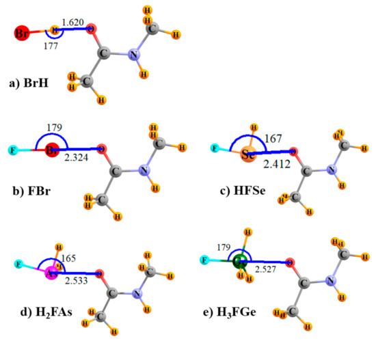 The optimized geometries of some of the sample systems are displayed in Figure 1; others are quite similar. Coordinates of all optimized complexes are available in the Supplementary Materials section. It may be noted that the relative orientations are as would be expected for each of the types of bonds under consideration here, commensurate with the positions of the σ-holes on each type of Lewis acid, and with the O atom of NMA serving as the electron donor atom.