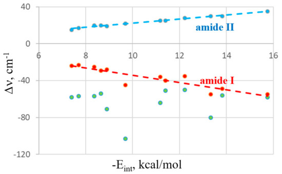 Relationship between MP2/aug-cc-pVDZ interaction energy and changes in frequencies of F–X stretch (green points), amide I (red), and amide II (blue). Broken lines indicate linear fits.