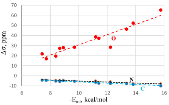 Relationship between MP2/aug-cc-pVDZ interaction energy and changes in NMR shielding of indicated atoms of NMA. Broken lines indicate linear fits.