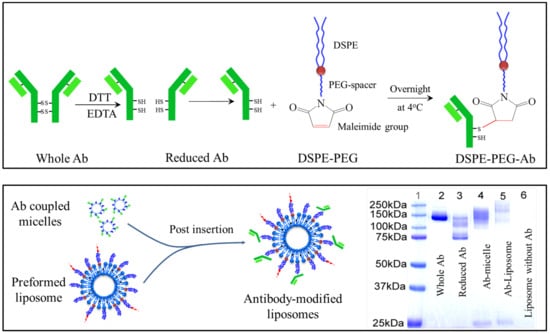 Schematic illustrations of DSPE-PEG-anti-CA IX Ab conjugation and the verification of the reduced antibody conjugation to micelles or liposomes by SDS-PAGE analysis with Coomassie blue staining.