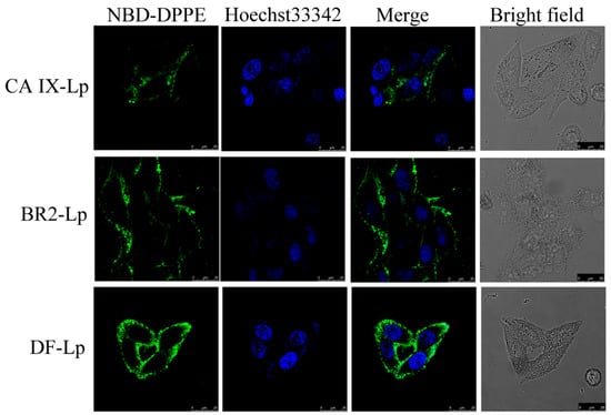 Cell association of NBD-DPPE labeled DF-liposomes compared to BR2-Lp and CA IX-Lp were imaged by CLSM after 3 h incubation with HepG2 cells. Scale bar = 25 μm. NBD-DPPE labeled liposomes showed green, and nuclei stained with Hoechst 33342 showed blue.