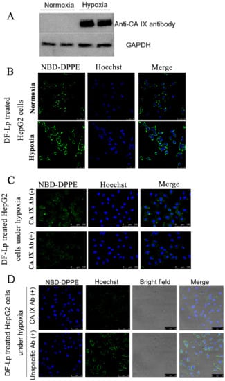 To investigate the specific cellular uptake of DF-Lp, we incubated the HepG2 cells under different oxygen supply condition to induce CA IX expression. CA IX receptors were expressed at high levels in hypoxic HepG2 cells using western blot but much lower in normoxic condition (Figure 3A). Next, we used these two cell lines to assess the specific binding properties of DF-Lp since anti-CA IX Ab was incorporated for the specific affinity. We incubated the NBD-DPPE-labeled DF-Lp for 3 h and evaluated the binding efficacy by CLSM. As shown in Figure 3B, the fluorescence within the CA IX positively expressed HepG2 cells was in a large amount than those CA IX negative HepG2 cells (p < 0.05) (Figure S4A). It should be mentioned that although CA IX is negatively expressed in normoxia condition, the DF-Lp with both BR2 peptide and anti-CA IX antibody modification could still bind to HepG2 cells due to its lipid composition and BR2 ligand [].