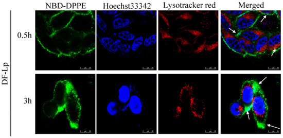 As it was reported that endocytosis mediated by receptors usually led to endosome formation [], and the drug is possible to be deactivated in the endosomes per se, it is essential to avoid DDS degradation in endosomes in order to complete its delivery to kill the cancer cells []. In our study, the colocalization of DF-Lp with endosomes/lysosomes was detected with endosomes/lysosomes stained by LysoTracker Red DND-99 to estimate the endosome escaping ability of the liposome. As shown in Figure 4, green fluorescence represented NBD-DPPE labeled DF-Lp carriers, and the red fluorescence represented the endosomes/lysosomes. For initial 0.5 h incubation of the DF-Lp with HepG2 cells, only a few DF-Lp entered the cells whereas the majority remained in endosomes/lysosomes (points by white arrow). After incubation for 3 h, in contrast, only a small portion of liposomes were still trapped in endosomes/lysosomes, and large area of green fluorescence was seen diffusing in the cytoplasm, demonstrating that DF-Lp had the ability to reach its ultimate target cytoplasm, which is in line with a previous report that BR2 liposome could successfully bypass endosomes/lysosomes and transfer into the cytosol []. As such, our study indicated that DF-Lp could be a good carrier for therapeutic agent delivery to the cell cytoplasm and purposefully kill the cancer cells.