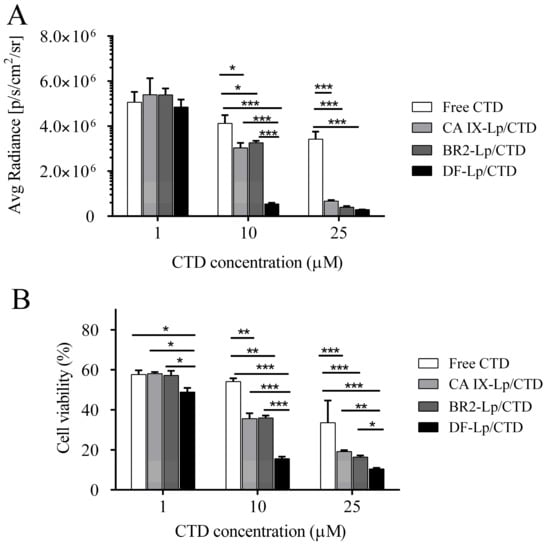 Anti-proliferative effects of the tested liposomes in vitro were evaluated on HepG2-red-Fluc cells using bioluminescence and MTT assay. As shown in Figure 5, the inhibition properties of DF-Lp/CTD showed both in the bioluminescence and MTT results in a dose-dependent change on the HepG2-red-Fluc cells. Besides, DF-Lp/CTD showed more significant inhibition on cell viability than the free CTD group (p < 0.01), which might be due to the enhanced solubility of the drug after liposomal encapsulation. Moreover, compared to the BR2-Lp/CTD and CA IX-Lp/CTD, DF-Lp/CTD at low concentration showed more cytotoxicity to HepG2-red-Fluc cells (p < 0.05), which should be attributable to the improved targeting efficacy of the bi-ligand modified liposomes. These results indicated the potent effects of this DF-Lp/CTD in vitro.