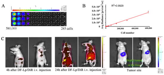 (A) In vitro imaging analysis of luciferase activity of HepG2-red-Fluc cells. (B) The photon flux plot as a function of increasing number of HepG2-red-Fluc cells obtained from IVIS each well (n = 3). (C) Representative in vivo imaging of the HCC orthotopic mice bearing luciferase-expressing tumors derived from HepG2-red-Fluc cells following i.v. injection of DF-Lp/DiR using the IVIS imaging system.