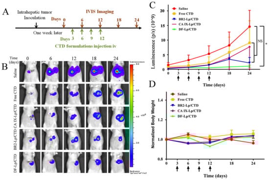 In vivo anticancer efficacy of DF-Lp/CTD on HepG2-red-Fluc orthotopic HCC tumors. (A) Scheme of HepG2-red-Fluc tumor inoculation and treatment at CTD dosage of 0.4 mg/kg. (B) Representative live IVIS images of HepG2-red-Fluc cell-bearing tumors with administration of D-luciferin with saline-treated mice served as a control. (C) Quantitative measures of luminescence (mean ± SEM) of the total flux of the tumors in the mice (n = 5). Arrows indicate drug administration time. * p < 0.05. (D) Bodyweight profiles of mice in different groups (n = 5, mean ± SEM).