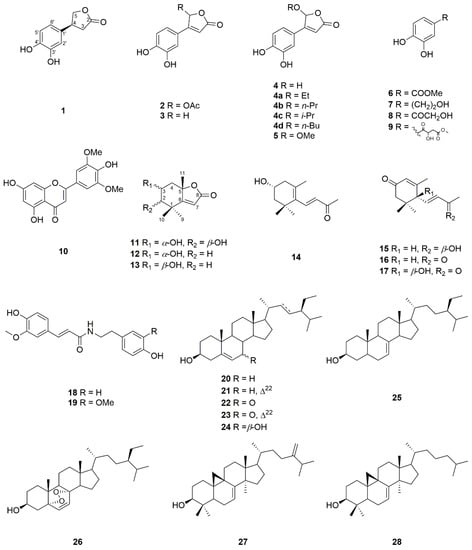 Phytochemical investigation of the whole plants of T. albiflora Kunth led to the isolation and characterization of three new compounds and 25 known compounds, which were identified by comparison with literature spectroscopic data and determined as 4-(3’,4’-dihydroxyphenyl)furan-2(5H)-one (3) [], bracteanolide A (4) [], bracteanolide B (5) [], methyl 3,4-dihydroxybenzoate (6) [], hydroxytyrosol (7) [], 1-(3,4-dihydroxyphenyl)-2-hydroxyethan-1-one (8) [], (±)-tradescantin (9) [], tricin (10) [], isololiolide (12) [], loliolide (13) [], (3R)-3-hydroxy-β-ionone (14) [], (6R,7E,9R)-9-hydroxy-4,7-megastigmadien-3-one (15) [], (E)-3,5,5-trimethyl-4-(3-oxobut-1-en-1-yl)cyclohex-2-enone (16) [], (S)-dehydrovomifoliol (17) [], N-trans-feruloyltyramine (18) [], N-trans-feruloyl-3-methoxytyramine (19) [], sitosterol (20) [], stigmasterol (21) [], 7-ketositosterol (22) [], 7-ketostigmasterol (23) [], 7β-hydroxysitosterol (24) [], schottenol (25) [], ergosterol peroxide (26) [], 24,25-dihydrocimicifugenol (27) [], 3-epicyclomusalenol (28) [] (Figure 1).
