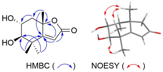 An additional hydroxy group was assigned at C-2 (δC 81.7) of 11 by comparing the NMR data of 12. The planar structure of 11 was confirmed by HMBC correlations shown in Figure 2. The di-axial orientations of H-2 and H-3 were deduced from the coupling constant of 9.3 Hz between them. The NOESY correlations between H-2 and Me-9; H-3 and Me-11; Me-10 and Me-11 established the relative configuration of 11. Thus, compound 11 was determined as a new apocarotenoid, named 2β-hydroxyepiloliolide.
