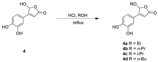 Bracteanolide A (20 mg) was dissolved in the corresponding alcohol (10 mL). Concentrated hydrochloric acid (3 drops) was added and the solution was refluxed and stirred for 12 h. The solvent was evaporated under vacuum to produce a yellow residue that was diluted with distilled water and fractionated twice with dichloromethane. The organic extracts were combined and dried over magnesium sulfate to give butenolide derivatives 4a–4d, in approximately 70% yield.