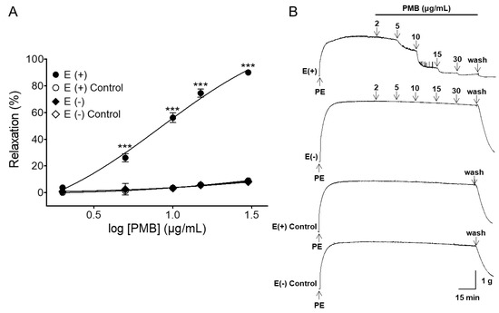 Cumulative concentration-response curves of PMB (2–30 μg/mL) in rat aortic rings with intact [(E+)] or denuded [(E−)] endothelium pre-contracted with phenylephrine (PE, 1 μM) (A). Representative traces under the indicated conditions (B). Values are expressed as mean ± SEM (n = 6). *** p < 0.001 vs. control.