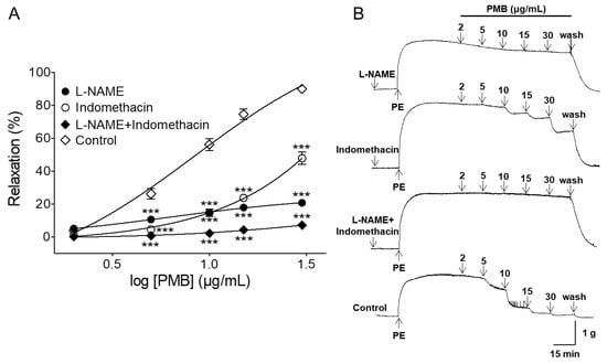 Concentration-dependent relaxation effect of PMB (2–30 μg/mL) on phenylephrine (PE, 1 μM)-pre-contracted endothelium-intact aortic rings in the presence and absence (control) of NG-nitro-l-arginine methyl ester (L-NAME, 100 μM), or indomethacin (10 μM), or a combination of L-NAME (100 μM) and indomethacin (10 μM) (A). Representative traces under the indicated conditions (B). Values are expressed as mean ± SEM (n = 6). *** p < 0.001 vs. control.