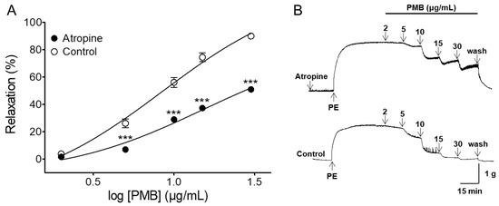 Relaxation responses induced by PMB (2–30 μg/mL) on phenylephrine (PE, 1 μM)-pre-contracted aortic rings in the presence or absence (control) of atropine (1 μM) (A). Representative traces under the indicated conditions (B). Values are expressed as mean ± SEM (n = 6). *** p < 0.001 vs. control.