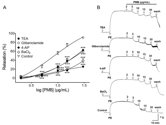 Relaxation responses induced by PMB (2–30 μg/mL) on endothelium-intact aortic rings pre-contracted with phenylephrine (PE, 1 μM) in the presence of tetraethylammonium (TEA, 5 mM), glibenclamide (10 μM), 4-aminopyridine (4-AP, 1 mM), or BaCl2 (30 μM) (A). Representative traces under the indicated conditions (B). Values are expressed as mean ± SEM (n = 6). *** p < 0.001 vs. control.
