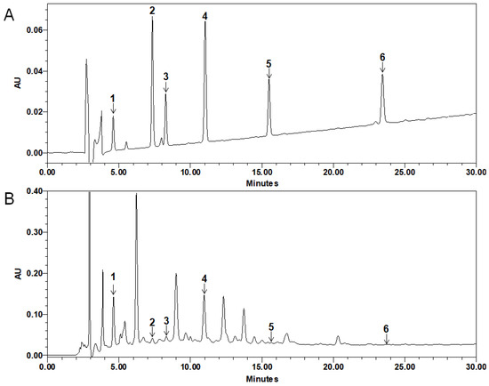 HPLC chromatogram of standard solution (A) and PMB (B) at 240 nm. 1; chlorogenic acid (retention time (RT) = 4.61 min), 2; caffeic acid (RT = 7.33 min), 3; rutin (RT = 8.30 min), 4; Genistein 7-O-β-glucopyranoside (G7G, RT = 10.96 min), 5; prunetin 5-O-β-glucopyranoside (P5G, RT = 15.66 min), 6; luteolin (RT = 23.65 min).