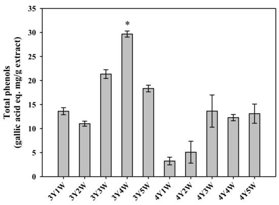 Total phenolic contents of ginseng berry extracts harvested at various time points. Rectangular bars and their error bars represent means and standard deviations, respectively (n = 3). The ‘mYnW’ on the x-axis means m-year-old ginseng berry harvested in the nth week of July. *, significantly different from other groups.
