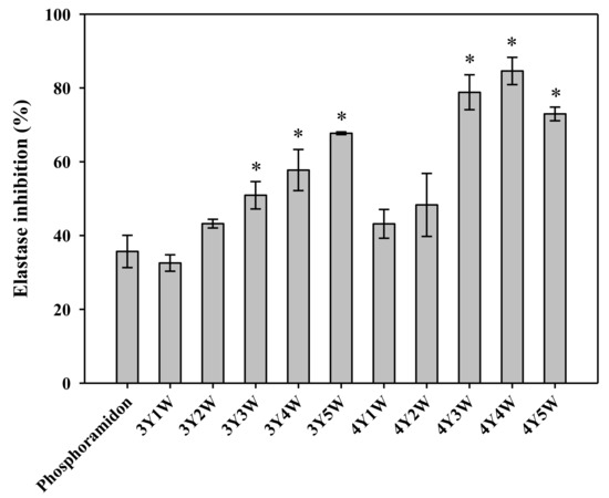 Elastase inhibitory activity was determined as previously described [22]. Briefly, 10 μL elastase derived from porcine pancreas (10 μg/mL) was mixed with 90 μL of 0.2 M Tris-HCl, 100 μL of STANA (2.5 mM, N-Succinyl-Ala-Ala-Ala-p-nitroanilide), and 50 μL of the sample and incubated at 37 °C for 30 min. The reaction mixture was then centrifuged at 15,000× g for 10 min to obtain supernatant. The absorbance of the supernatant was measured at 405 nm using a microplate reader. Phosphoramidon, an inhibitor of elastase from Pseudomonas aeruginosa, was used as a positive control.