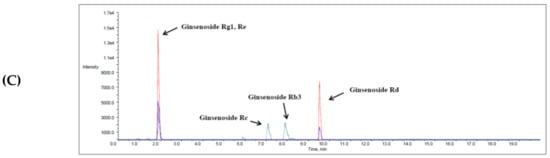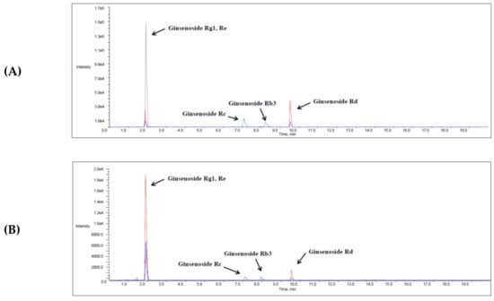 Contents of ginsenosides Rb3, Rc, Rd, Re, and Rg1 were determined by high-performance liquid chromatography-tandem mass spectrometry (LC-MS/MS) analysis. The LC-MS/MS system consisted of a Sciex HPLC system coupled with a triple quadrupole mass spectrometer (Triple Quad 4500, AB Sciex, Framingham, MA, USA). The mobile phase for the HPLC system consisted of water containing 0.1% formic acid (solvent A) and acetonitrile containing 0.1% formic acid (solvent B). It was eluted at 0.4 mL/min. A gradient elution protocol was used: solvent A:solvent B, v/v ramped from 72:28 to 65:35 for 6 min; ramped from 65:35 to 0:100 for 4 min; held at 0:100 for 1 min; back to 72:28 for 4 min; and then held at 72:28 form 5 min. Chromatographic separation was performed using a reversed-phase column ZORBAX Eclipse Plus (C18, 3 × 100 mm, particle size 1.8 μm; Agilent, Santa Clara, CA, USA), which was maintained at 40 °C. To avoid contamination by particles, the mobile phase was filtered through a 0.45 μm filter device (PEEK, Supelco, Taufkirchen, Germany) before use. The mass spectrometer was operated in the positive ion mode using multiple reaction monitoring (MRM). The following ion source parameters were used: temperature, 600 °C; collision gas pressure, 9 mTorr; sheath gas pressure, 40 Arb; and auxiliary valve flow rate, 10 Arb. Detailed mass spectrometry parameters are listed in Table 3.