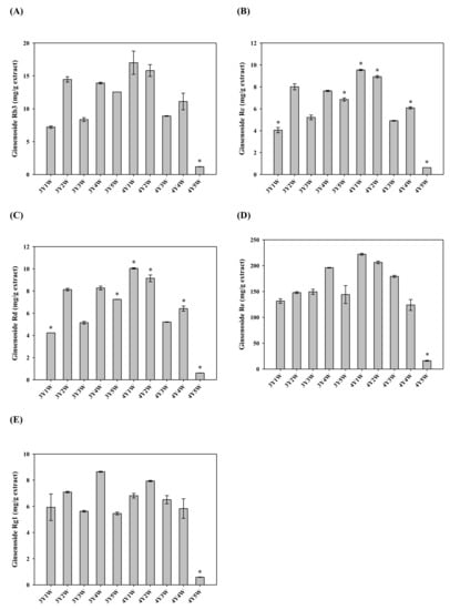 Contents of ginsenosides Rb3 (A), Rc (B), Rd (C), Re (D), and Rg1 (E) in ginseng berry extracts harvested at various time points. Rectangular bars and their error bars represent means and standard deviations, respectively (n = 3). The ‘mYnW’ on the x-axis means m-year-old ginseng berry harvested in the nth week of July. *, significantly different from other groups.