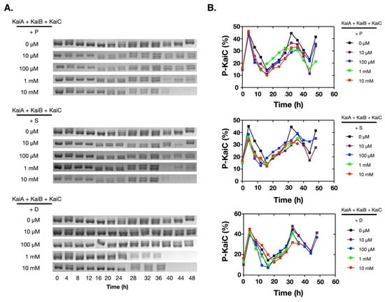 Polyamines disrupted the in vitro KaiABC oscillator at 1 mM and/or 10 mM. The purified Kai proteins (KaiA, KaiB, and KaiC) were mixed and incubated at 30 °C. The phosphorylation states of KaiC were analyzed by SDS-PAGE, and the percentage of the phosphorylated KaiC (P-KaiC) was determined with ImageJ (NIH). The upper bands were P-KaiC, and the lower bands were de-phosphorylated KaiC. The SDS-PAGE gels containing the KaiC bands were shown in (A), and the corresponding quantitative analyses were shown in (B). P: Putrescine; S: Spermine; D: Spermidine.