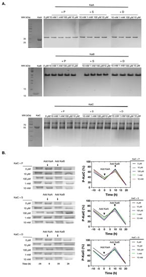 Polyamines did not directly interfere the functions of the Kai proteins. (A) The Kai proteins were incubated with polyamines for 4 h and then the oligomeric states of Kai proteins were analyzed with native PAGE gels. The protein names are noted above the top lines. Kai proteins did not show significant changes in their oligomeric states. The Kai proteins were highly pure as shown in the left SDS-PAGE gels with molecular markers. (B) The Kai proteins were incubated with polyamines for 4 h, and the activities of the Kai proteins were analyzed. When incubated alone at 30 °C, KaiC underwent de-phosphorylation. After the addition of KaiA, the phosphorylation of KaiC was stimulated. With the addition of KaiB, KaiC de-phosphorylated again. The upper bands were P-KaiC, and the bottom bands were de-phosphorylated KaiC. P: Putrescine; S: Spermine; D: Spermidine.