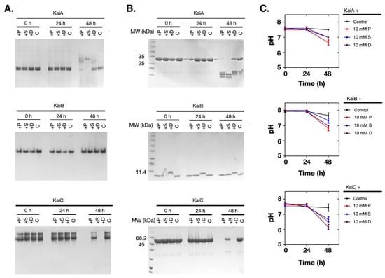 Supposing that the pH change of the solution was coupled with the denaturation of the proteins, we measured the time-dependent changes of the pH values and the proteins. As shown in Figure 3A–C, when the pH value of the solution dropped at 48 h (Figure 3C), both KaiA and KaiC had obvious changes in their oligomerization states and the soluble amounts (Figure 3A,B). However, KaiB was relatively stable. Therefore, these results showed that when the Kai proteins were incubated with polyamines at 30 °C, the pH changes and the denaturation of the Kai proteins were dependent on polyamines, but the protein denaturation was not caused by the pH change of the solution.