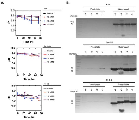To investigate if the pH change and the protein denaturation caused by polyamines were protein-dependent, we used more proteins for comparison. We chose bovine serum albumin (BSA), the human tau protein, and the 14-3-3 protein. Following the same procedures, we noticed that these proteins were more stable during the incubation and the pH values did not change (Figure 4A,B). Therefore, this result proved that the pH change and the protein denaturation caused by polyamines were protein-dependent.