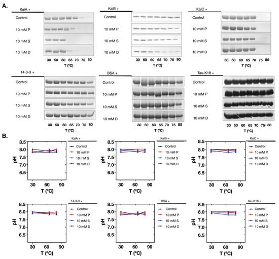 Polyamines induced the decrease of the thermal stability of Kai proteins. (A) The tested proteins showed differences in thermal stability when incubated with polyamines. (B) The pH values did not change during the thermal stability test for all proteins. The protein names are noted above the top lines. P: Putrescine; S: Spermine; D: Spermidine.