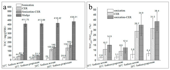 The extracted amounts of extracellular polymeric substances (EPS) when utilizing sonication, cation exchange resin (CER), and sonication-CER. (a): TOCEPS and TOCsludge; (b): TOCEPS/TOCsludge ratio. Abbreviations: TOC: total organic carbon; VSS: volatile suspended solid.