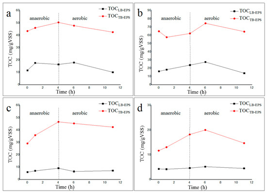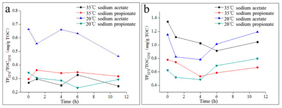 As shown in Figure 6, TPEPS/TOCEPS of LB-EPS changed irregularly during the anaerobic–aerobic cycle, and TPEPS/TOCEPS of LB-EPS in the activated sludge of the 20 °C sodium acetate reactor was significantly higher than that of the other three reactors. Moreover, in the same activated sludge, the phosphorous adsorption/complexing performance of TB-EPS was significantly higher than that of LB-EPS. Specifically, the TPEPS/TOCEPS of TB-EPS in activated sludge from the 35 °C sodium acetate reactor and sodium propionate reactor and from the 20 °C sodium acetate reactor and sodium propionate reactor were 2.79–4.97, 1.56–2.63, 1.07–2.88 and 1.70–2.98 times higher than those of LB-EPS, respectively. The above phenomenon is mainly explained by two aspects. LB-EPS and TB-EPS were extracted via sonication and CER, respectively, and CER was more efficient at extracting phosphorus from EPS than sonication. Furthermore, the affinity for phosphate of TB-EPS was stronger than that of LB-EPS.