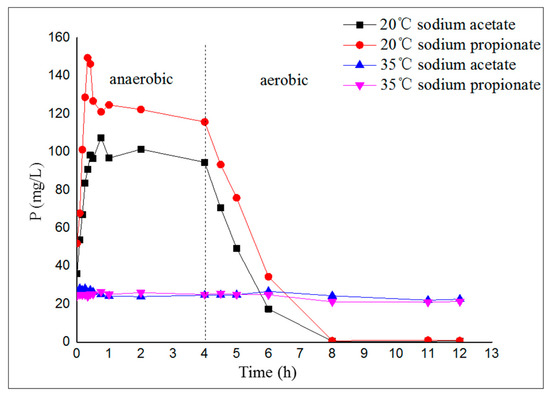 The activated sludge of four lab-scale A/O-SBR reactors was fed synthetic wastewater, adopting sodium acetate or sodium propionate as the sole carbon source. The chemical oxygen demand (COD): nitrogen (N): phosphorus (P) ratio of the synthetic wastewater was 100:5:5, and the pH was approximately 7.0, and the trace elements are shown in Table S1. The reactors had a working volume of 15 L and were operated for 2 cycles every day, adopting instantaneous wastewater filling. Each cycle lasted for 12 h, involving a 4-h anaerobic period, 7 h of aeration, a 50-min settlement time, 5 min of decanting, and 5 min of idling. The temperatures of the 4 reactors were controlled at 20 ± 1 °C or 35 ± 1 °C. The solid retention times (SRTs) were approximately 20 d, with discharging of the mixed liquid occurring every day. The dissolved oxygen (DO) concentrations under anaerobic conditions were 0.2–0.5 mg/L, which would be directly related to the growth status, phosphorus release capacity, and the ability to synthesize an organic matrix of phosphorus-accumulating organisms (PAOs). Phosphorus uptake by microorganisms under aerobic conditions was much higher than that released under anaerobic conditions. Fine air bubbles for aeration were supplied through a dispenser at the bottom of the reactor with an airflow rate of 1.6 L/h, which ensured that the DO concentration at the end of the aeration stage was 3.0–5.0 mg/L. The mixed liquid suspended solids (MLSS), sludge volume index (SVI) and the COD and TP of the effluent were monitored every day. After the values of the parameters remained relatively stable for 2 months, the experimental study was carried out.