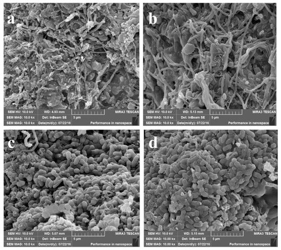 Microbial morphology of the four reactors observed by SEM. (a): Microbial morphology of a 35 °C sodium acetate reactor; (b): microbial morphology of a 35 °C sodium propionate reactor; (c): microbial morphology of a 20 °C sodium acetate reactor; (d): microbial morphology of a 20 °C sodium propionate reactor.