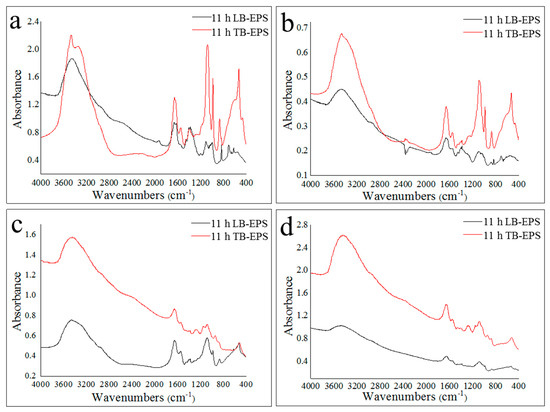 IR spectra of LB-EPS and TB-EPS at the later aerobic stage. (a): LB-EPS and TB-EPS from a 35 °C sodium acetate reactor; (b): LB-EPS and TB-EPS from a 35 °C sodium propionate reactor; (c): LB-EPS and TB-EPS from a 20 °C sodium acetate reactor; (d): LB-EPS and TB-EPS from a 20 °C sodium propionate reactor.