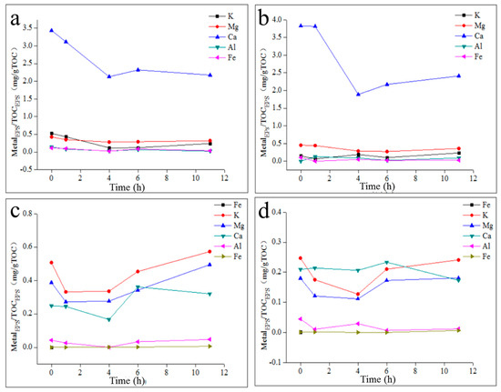 The content and variation of metal elements and TP in the TB-EPS during the anaerobic–aerobic cycle. (a): TB-EPS from a 35 °C sodium acetate reactor; (b): TB-EPS from a 35 °C sodium propionate reactor; (c): TB-EPS from a 20 °C sodium acetate reactor; (d): TB-EPS from a 20 °C sodium propionate reactor.